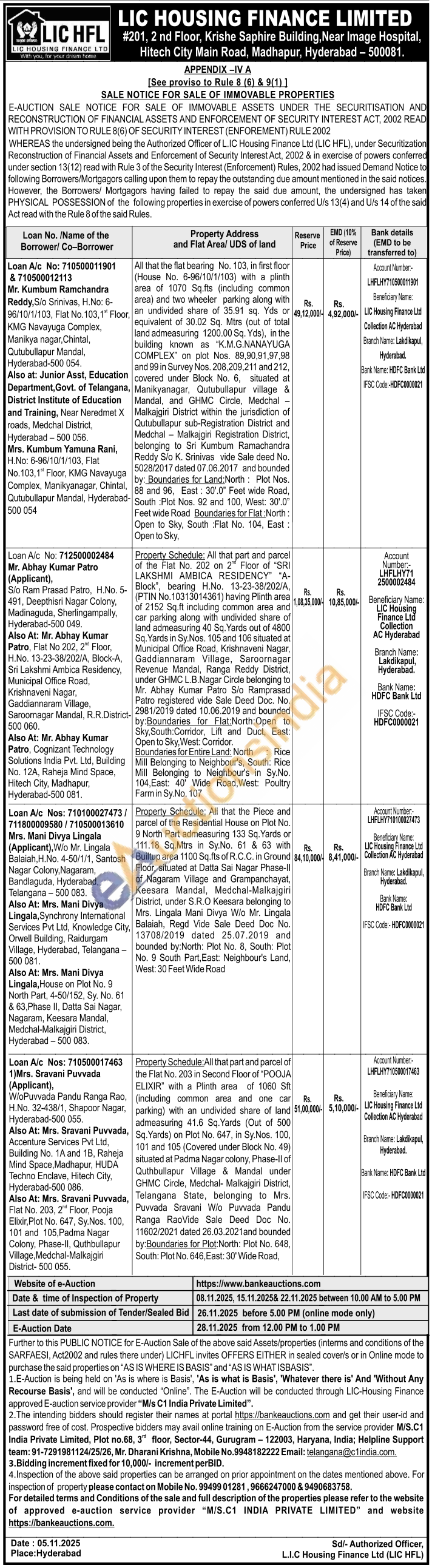 Property Schedule: All that part and parcel of the Flat No. 202 on 2 Floor of "SRI LAKSHMI AMBICA RESIDENCY A Block" bearing H.No. 13-23-38/202/A, (PTIN No. 10313014361) having Plinth area of 2152 Soft including common area and car parking along with undivided share of land admeasuring 40 Sq. Yards out of 4800 Sq. Yards in Sv.Nos. 105 and 106 situated at Municipal Office Road, Krishnaveni Nagar, Gaddiannaram Village, Saroornagar Revenue Mandal, Ranga Reddy District, under GHMC L.B.Nagar Circle belonging to Mr. Abhay Kumar Patro Sio Ramprasad Patro registered vide Sale Deed Doc. No. 2981/2019 dated 10.06.2019 and bounded by:Boundaries for Flat North Open to Sky, South Corridor, Lift and Duct, East Open to Sky, West: Corndor.