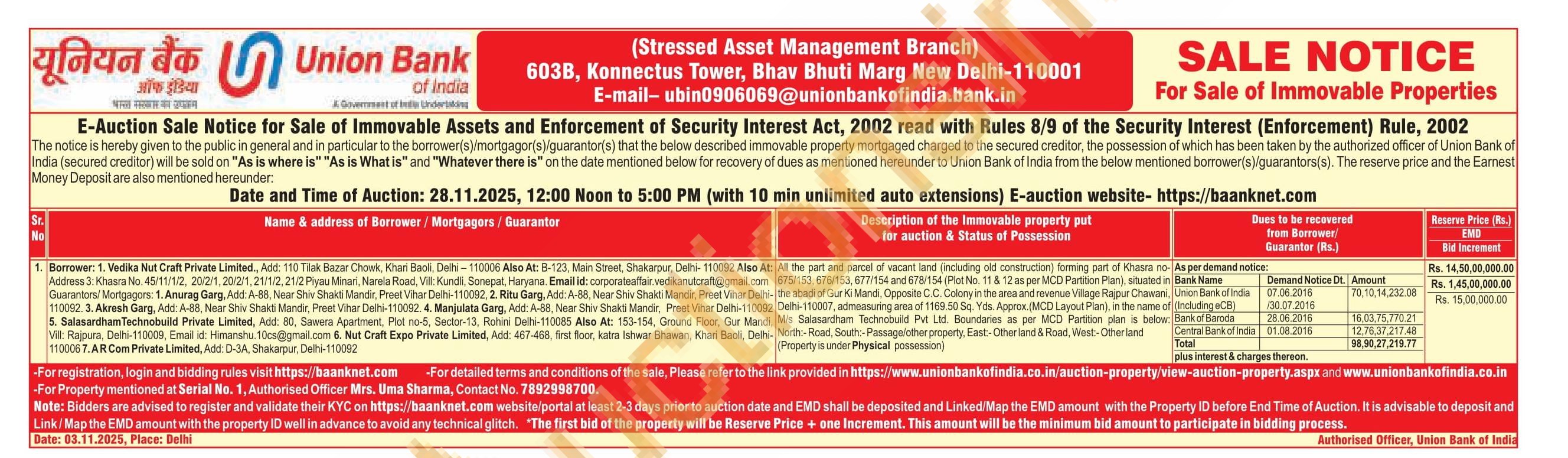 All the part and parcel of vacant land (including old construction) forming part of Khasra no-675/153,676/153, 677/154 and 678/154 (Plot No. 11 & 12 as per MCD Partition Plan), situated in the abadi of Gur Ki Mandi, Opposite C.C. Colony in the area and revenue Village Rajpur Chawani, Delhi-110007, admeasuring area of 1169.50 Sq. Yds. Approx. (MCD Layout Plan), in the name of M/s Salasardham Technobuild Pvt Ltd. Boundaries as per MCD Partition plan is below: North:-Road, South:- Passage/other property, East:- Other land & Road, West:- Other