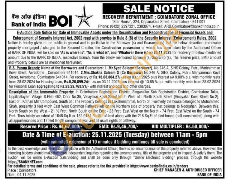In Coimbatore Registration District, Singanallur Sub Registration District, Coimbatore Taluk, Uppilipalayam Village, S.F.No 462. Door No.35, Vinayakar Kovil Street No.2, West of North South Street (Vinayakar Kovil Street No.2). East of: Kothari Mill Compound, South of: The Property belongs to Lakshmiammal, North of: Formerly the house belonged to Mohammed Shah, presently 3 feet width East West Common Pathway left on the Northern side of property that belongs to Noorjahan. Between this. North South on the West-21 Feet, North South on the East-23 Feet, East West on the North-74 Feet, East West on the South-74 Feet. Thus totally an extent of 1646 Sq.ft or 152.9184 Sq.Mtr of land along with the 218 Sq.Ft of tiled house (half constructed) along with all appurtenances and 17 feet length compound wall and all usual rights of pathway.