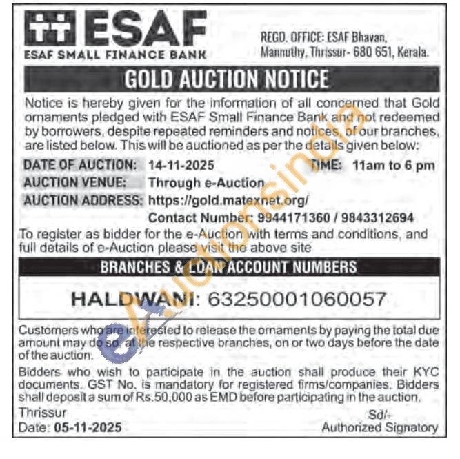 ESAF SMALL FINANCE BANK Gold Auctions Auction in Thrissur