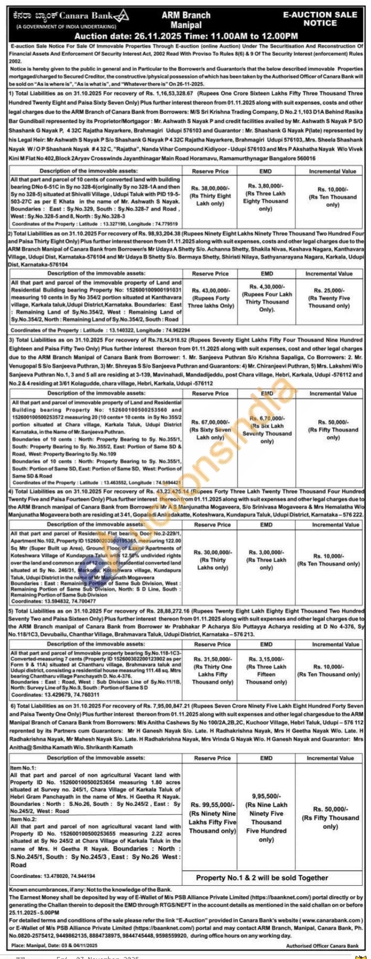 6) Item No.1: All that part and parcel of non agricultural Vacant land with Property ID No. 152600100500253654 measuring 1.80 acres situated at Survey no. 245/1, Chara Village of Karkala Taluk of Hebri Gram Panchayath in the name of Mrs. H Geetha R Nayak. Boundaries: North S.No.26, South Sy No.245/2, East: Sy No.245/2, West: Road Item No.2: All that part and parcel of non agricultural vacant land with Property ID No. 152600100500253655 measuring 2.22 acres situated at Sy No 245/2 at Chara Village of Karkala Taluk in the name of Mrs. H Geetha R Nayak. Boundaries: North: S.No.245/1, South: Sy No.245/3, East: Sy No.26 West: Road