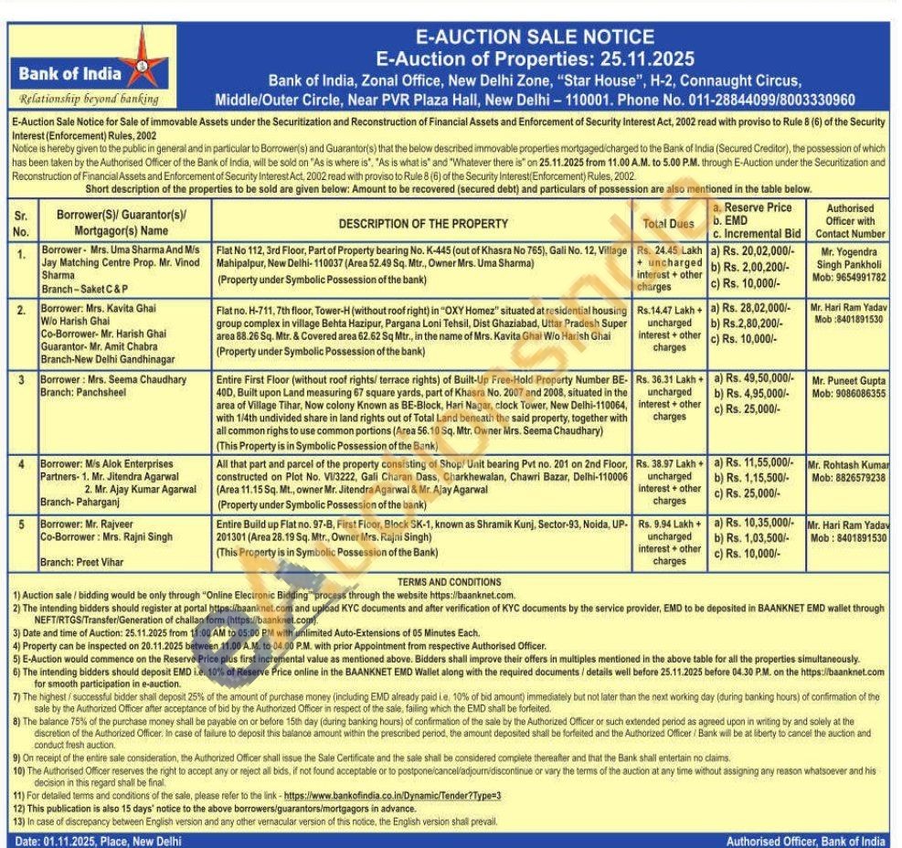 Entire First Floor (without roof rights/ terrace rights) of Built-Up Free-Hold Property Number BE-40D, Built upon Land measuring 67 square yards, part of Khasra No. 2007 and 2008, situated in the area of Village Tihar, Now colony Known as BE-Block, Hari Nagar, clock Tower, New Delhi-110064, with 1/4th undivided share in land rights out of Total Land beneath the said property, together with all common righs to use common portions (Area 56.10 Sq. Mtr. Owner Mrs. Seema Chaudhary)