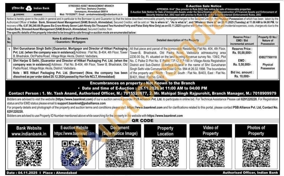 All that piece and parcel of the immovable Residential Flat No. 404, 4th Floor, Tower-B, Bhadralok, Old Padra Road, Vadodara admeasuring area 2230.00 Sq. Ft. situated on the land bearing Revenue survey No. 139/2, Plot No. C Paike D Plot No. E Paike, T.P. 12. F.P.199 in Village-Akota Registration District and Sub-District Vadodara Gujarat in the name of Shri Gurusharan Singh Sethi vide Conveyance Deed Sr No. 994 dt 26.02.1998. The boundaries of the property are: North Tower D, South: Flat No. B/403, East: Flat No. B/401, West: Flat No. C/404