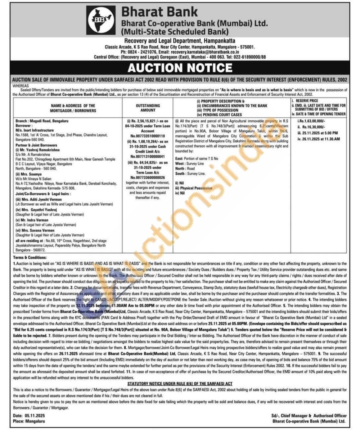 All the piece and parcel of Non Agricultural immovable property in R.S No.174/3(Part) IT S No.748/3(Part)] admeasuring 6.25cents(Western portion) in No.90A, Boloor Village of Mangaluru Taluk, within No.5, mannagudda Ward of Mangalore City Corporation & within the Sub Registration District of Mangalore City, Dakshina Kannada along with building constructed thereon with all improvement & mamool easementary right and bounded by: