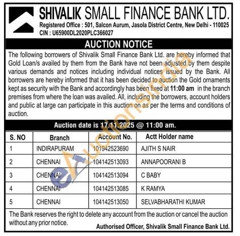 Shivalik Small Finance Bank Ltd Gold Auctions Auction in Chennai