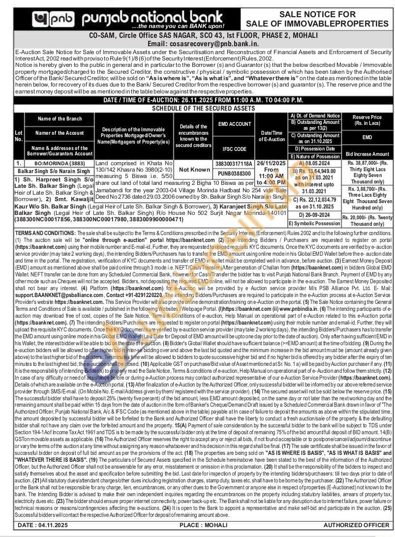 Land comprised in Khata No 130/42, measuring 5 Biswa ie. 5/50 total land measuring 2 Bigha 10 Biswa as perr the year 2003-04 Village Morinda Hadbast No 254 vide Sale