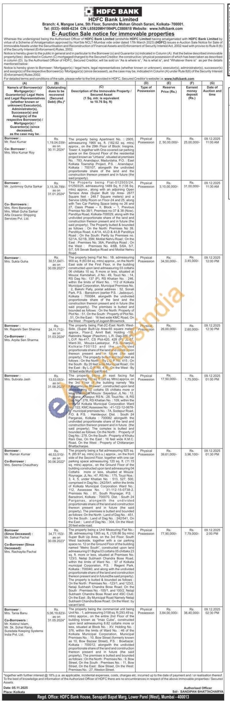 The property being Apartment No. 2005, admeasuring 1965 sq. ft. (182.62 sq. mtrs) approx., on the 29th Floor of Block: Insignia, Tower: 4, together with One covered car parking space on the Ground Floor of the residential project known as "Urbana", situated at premises No.: 783, Anandapur, Madurdaha, P.O.: East Kolkata Township Project, P.S. Anandapur, Kolkata 700107, alongwith the undivided proportionate share of the land and the construction thereon present and in future (the said property)