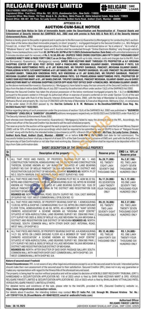 ALL THAT PIECE AND PARCEL OF PROPERTY BEARING SHOP NO. 1 ADMEASURING 13.05 SQ. MTRS & SHOP NO.2 ADMEASURING 19.41 SQ. MTRS ON LOWER GROUND FLOOR TOTAL ADMEASURING 32.46 SQ. MTRS, AS A MEMBER OF "KANT GOVIND OWNERS ASSOCIATION A SCHEME KNOWN AS "KRISHNA SHOP CENTRE SITUATED AT NON-AGRICULTURAL LAND BEARING SURVEY NO. 2004/360 PAIKI | CITY SURVEY NO 3925 & 3926) OF MOUJE VILLAGE MEHSANA TALUKA MEHSANA & DISTRICT AND REGISTRATION SUB DISTRICT OF MEHSANA BOUNDED AS: NORTH: PASSAGE, SOUTH COMMON WALL WITH OTHER SHOP, EAST: INTERNAL ROAD, WEST: WALL OF SHOP NO 3