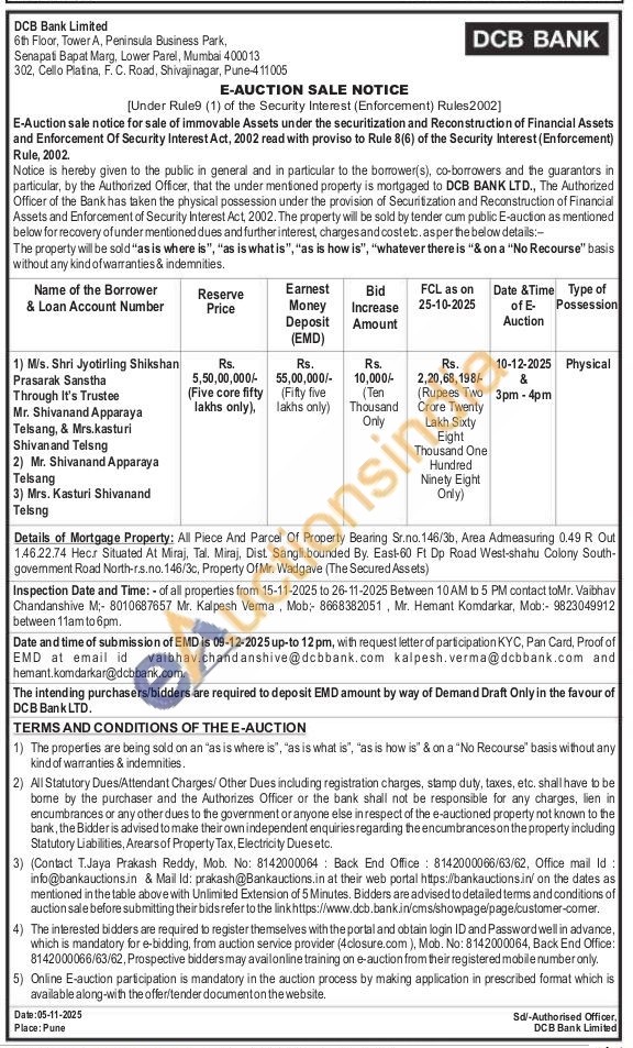 Details of Mortgage Property: All Piece And Parcel Of Property Bearing Sr.no. 146/3b, Area Admeasuring 0.49 R Out 1.46.22.74 Hecr Situated At Miraj, Tal. Miraj, Dist., Sangli.bounded By. East-60 Ft Dp Road West-shahu Colony South-government Road North-r.s.no. 146/3c, Property Of Mr. Wadgave (The Secured Assets)