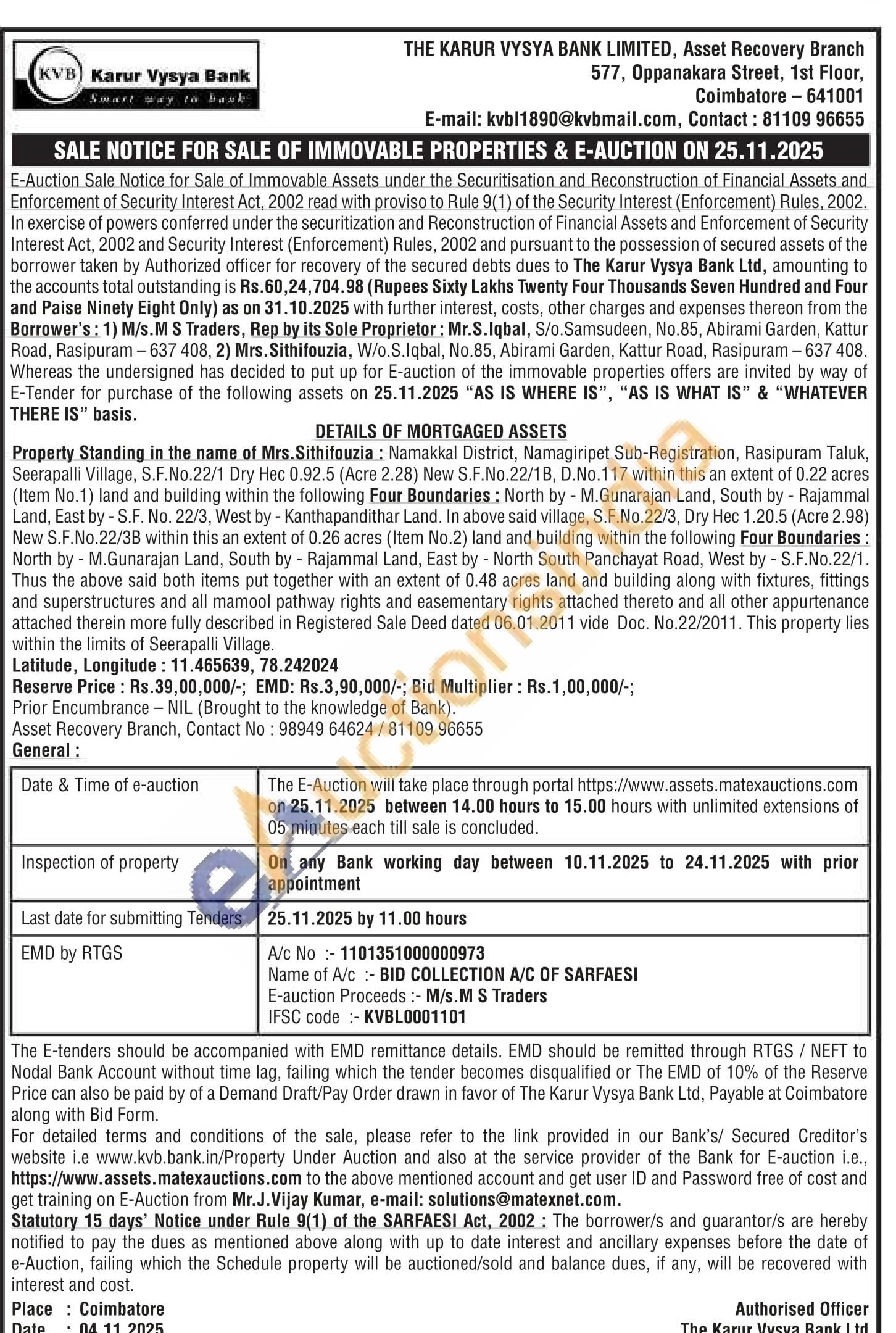 Namakkal District, Namagiripet Sub-Registration, Rasipuram Taluk, Seerapalli Village, S.F.No.22/1 Dry Hec 0.92.5 (Acre 2.28) New S.F.No.22/1B, D.No.117 within this an extent of 0.22 acres (Item No.1) land and building within the following Four Boundaries: North by M.Gunarajan Land, South by - Rajammal Land, East by-S.F. No. 22/3, West by - Kanthapandithar Land. In above said village, S.F.No. 22/3, Dry Hec 1.20.5 (Acre 2.98) New S.F.No.22/3B within this an extent of 0.26 acres (Item No.2) land and building within the following Four Boundaries: North by M.Gunarajan Land, South by Rajammal Land, East by North South Panchayat Road, West by - S.F.No.22/1. Thus the above said both items put together with an extent of 0.48 acres land and building along with fixtures, fittings and superstructures and all mamool pathway rights and easementary rights attached thereto and all other appurtenance attached therein more fully described in Registered Sale Deed dated 06.01.2011 vide Doc. No.22/2011. This property lies within the limits of Seerapalli Village.