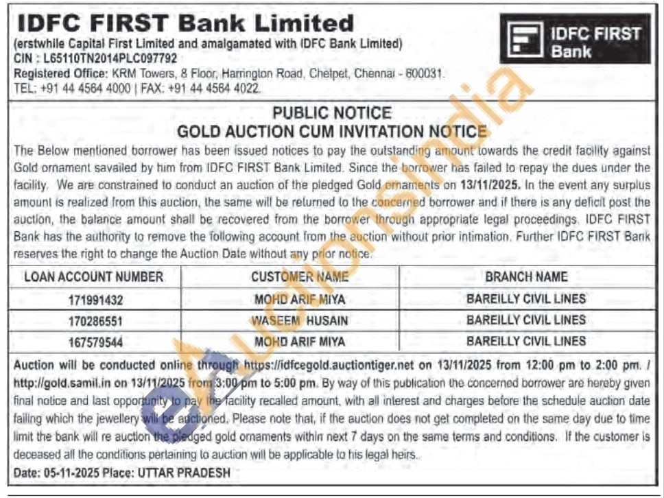 IDFC First Bank Ltd Gold Auctions Auction in Bareilly