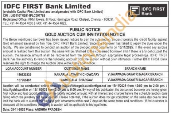 IDFC First Bank Ltd Gold Auctions Auction in Vijayawada