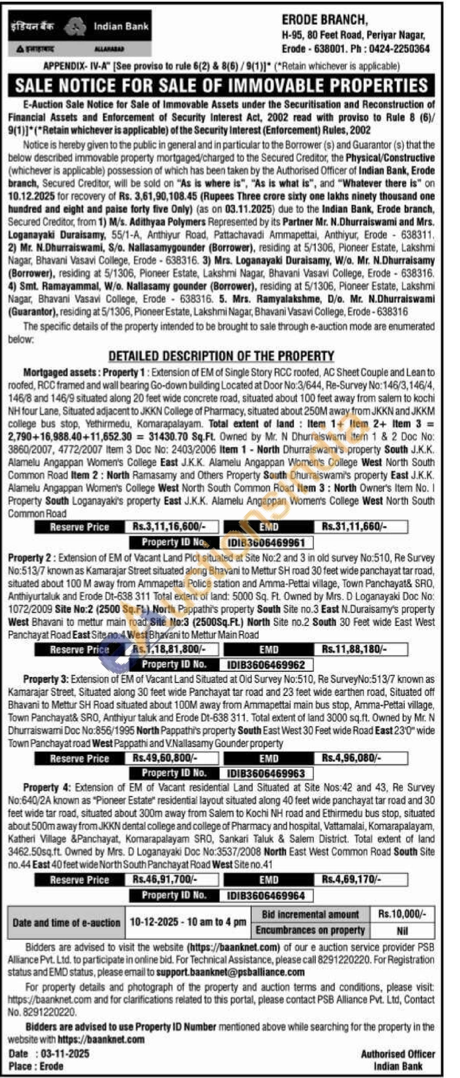 Property 3: Extension of EM of Vacant Land Situated at Oid Survey No: 510, Re SurveyNo:513/7 known as Kamarajar Street, Situated along 30 feet wide Panchayat tar road and 23 feet wide earthen road, Situated off Bhavani to Mettur SH Road situated about 100M away from Ammapettai main bus stop, Amma-Pettai village, Town Panchayat& SRO, Anthiyur taluk and Erode Dt-638 311. Total extent of land 3000 sq.ft. Owned by Mr. N Dhurraiswami Doc No:856/1995 North Pappath's property South East West 30 Feet wide Road East 230" wide Town Panchayat road West Pappathi and V.Nallasamy Gounder property