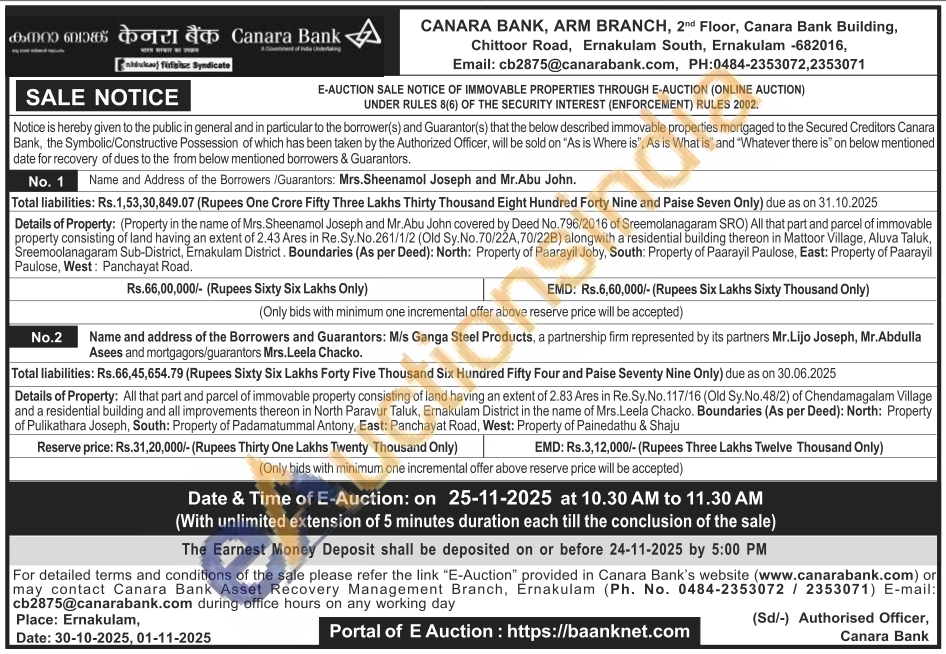 Details of Property: (Property in the name of Mrs. Sheenamol Joseph and Mr.Abu John covered by Deed No. 796/2016 of Sreemolanagaram SRO) All that part and parcel of immovable property consisting of land having an extent of 2.43 Ares in Re.Sy.No.261/1/2 (Old Sy. No. 70/22A, 70/22B) alongwith a residential building thereon in Mattoor Village, Aluva Taluk, Sreemoolanagaram Sub-District, Ernakulam District. Boundaries (As per Deed): North: Property of Paarayil Joby, South: Property of Paarayil Paulose, East: Property of Paarayil Paulose, West: Panchayat Road.