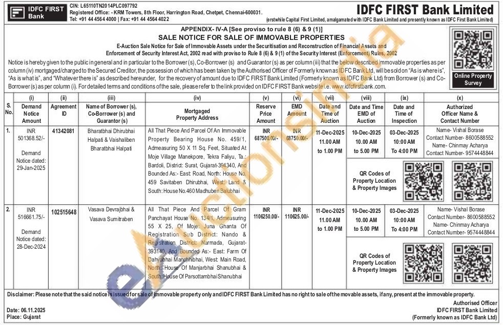 All That Piece And Parcel Of An Immovable Property Bearing House No. 459/1, Admeasuring 50 X 11 Sq. Feet, Situated At Moje Village Manekpore, Tekra Faliyu, Ta.: Bardoli, District: Surat, Gujarat-394340, And Bounded As: East Road, North: House No. 459 Savitaben Dhirubhai, West: Land & South: House No.460 Madhuben Balubhai