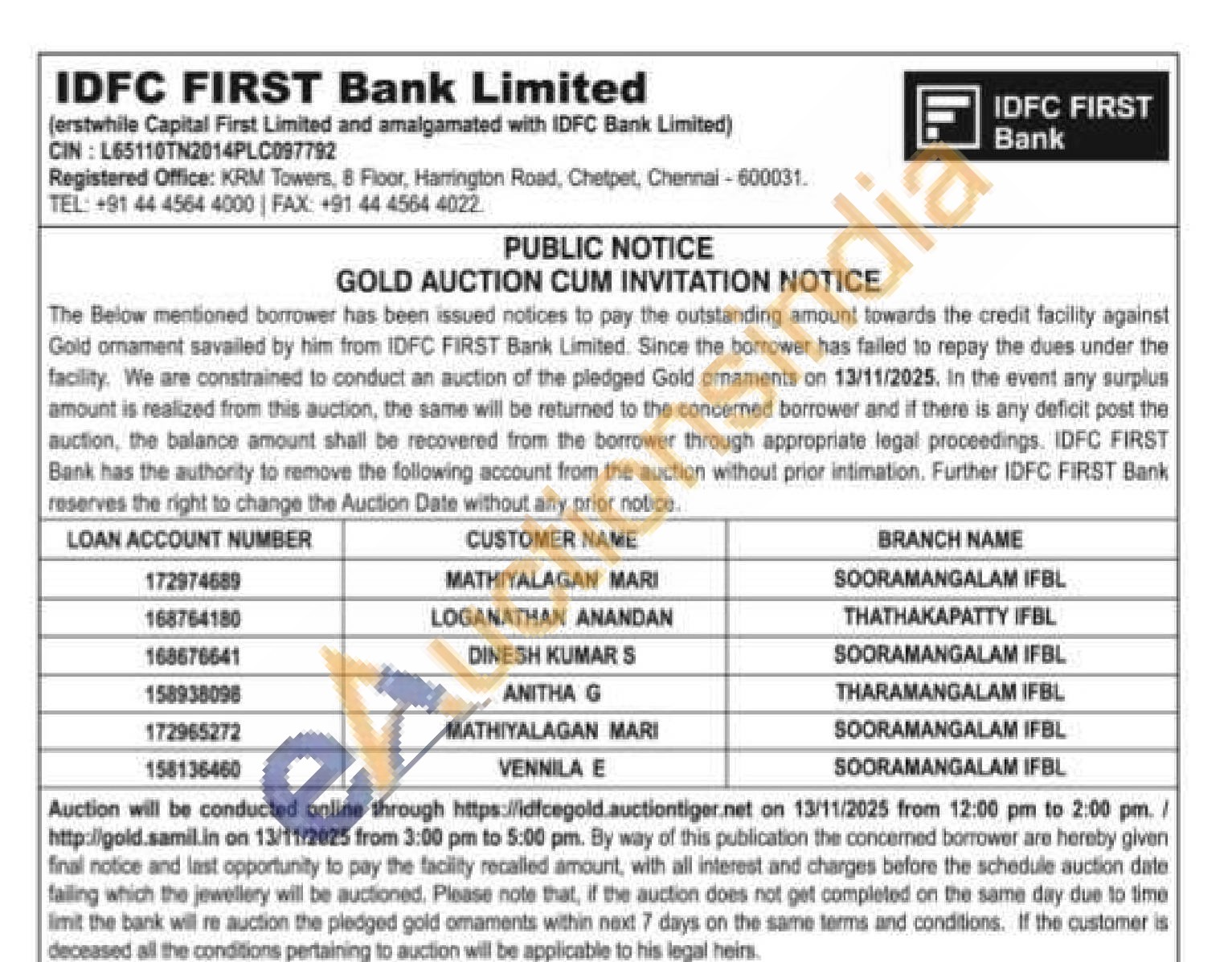 IDFC First Bank Ltd Gold Auctions Auction in Chennai