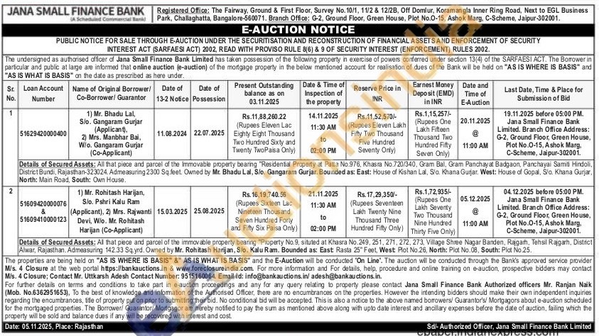 Details of Secured Assets: Al that piece and parcel of the immovable property bearing "Property No.9, situted at Khasra No.249, 251, 271, 272, 273, Village Shree Nagar Banden, Rajgarh, Tehsil Rajgarh, Distinct Alwar, Rajasthan. Admeasuring 142.33 Sq, yrd. Owned by Mr. Rohitash Harijan, Slo, Kalu Ram. Bounded as: East: Rasta 25" Feet, West Plot No.26, North: Plot No.08, South: Plot No.25