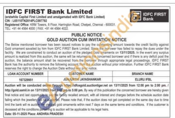 IDFC First Bank Ltd Gold Auctions Auction in Chennai