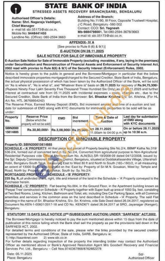 SCHEDULE-'A' PROPERTY: All that piece and parcel of Property bearing Site No.2/4, BBMP Katha No.319/536-2/4, formed out of converted land in Sy. No.2/4, Converted from agricultural purpose to Non-Agricultural Residential Purposes vide Official Memorandum No. ALN(SU) SR-19/2008-09 dated 04/12/2008, issued by the Spl. Deputy Commissioner, Bengaluru District, Bengaluru, situated at Doddakallasandra Village, Uttarahalli Hobli, Bengaluru South Taluk, measuring East to West 80 ft and North to South (165+160)/2, in all measuring an extent of 13000 Sq.ft., and bounded on the: East by: Property of Sri M.N. Gosakan, West by: Temple and Road, North by: Property of Rajashekar, South by: Sy. No.2/4. MORTGAGED PROPERTY: SCHEDULE-'B' PROPERTY: 225 Sq. ft.,of undivided share, right, title and interest of the land in the Schedule 'A' Property conveyed to the Purchaser herein. SCHEDULE-C PROPERTY: Flat bearing No.004, in the Ground Floor, in the Apartment building known as "Peepal Tree' constructed on Schedule-A' Property together with Super built up area of 1050 Sq. feet, consisting of Two Bed Rooms, Living, Kitchen, Bathroom and Toilet, etc. including One Car Parking Space, with all Common amenities and services in the common area on the land described in Schedule-A Property. The said Flat standing in the name of Sri. Bhaskar Krishna, S/o. Sri. Krishna, vide Sale Deed dated 26.04.2017, registered as Document No.KEN-1-00601/2017-18 and CD No. KEND671 dated 26.04.2017 at SRO, Jayanagar (Kengeri), Bengaluru