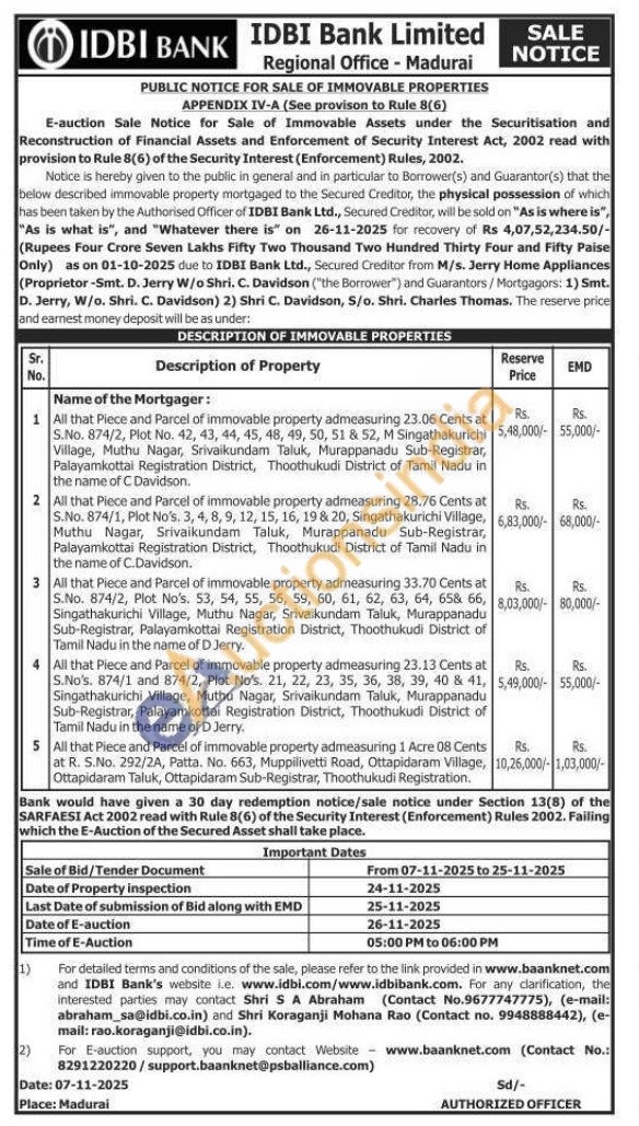 5)All that Piece and Parcel of immovable property admeasuring 1 Acre 08 Cents at R. S.No. 292/2A, Patta. No. 663, Muppilivetti Road, Ottapidaram Village, Ottapidaram Taluk, Ottapidaram Sub-Registrar, Thoothukudi Registration