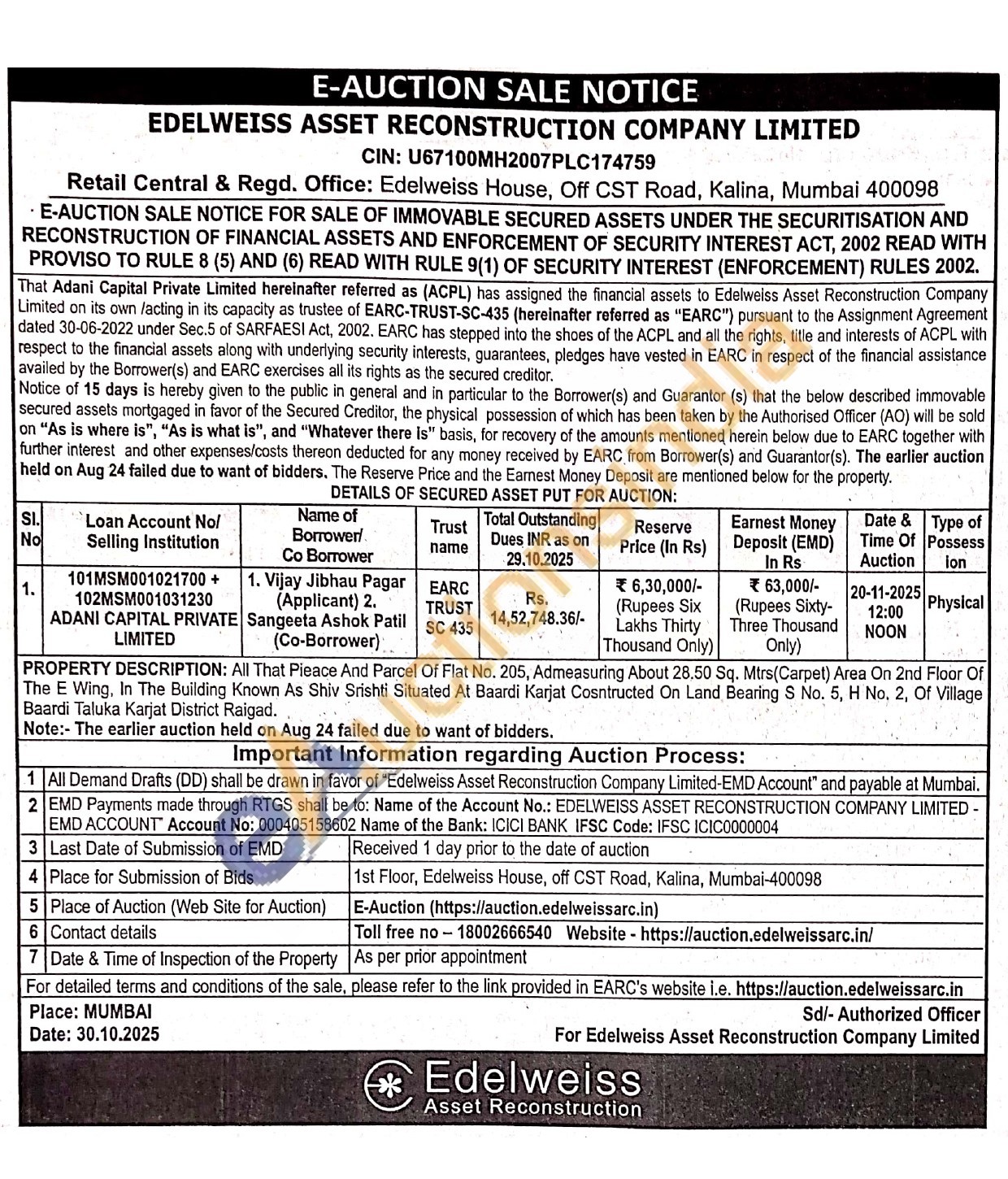 PROPERTY DESCRIPTION: All That Pieace And Parcel Of Flat No. 205, Admeasuring About 28.50 Sq. Mtrs(Carpet) Area On 2nd Floor Of The E Wing, In The Building Known As Shiv Srishti Situated At Baardi Karjat Cosntructed On Land Bearing S No. 5, H No. 2, Of Village Baardi Taluka Karjat District Raigad. Note: The earlier auction held on Aug 24 failed due to want of bidders.