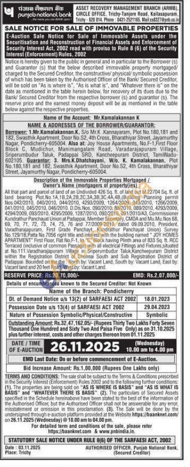 All that part and parcel of land of an Undivided 426 Sq. ft. of land out of 22704 Sq. ft. of land bearing Plot No 1A 1B 2A 28,20,3A,38,30,4A, 4B, (Building Planning permit Nos.042/2010, 040/2010, 044/2010, 4293/2009, 1264/2009, 043/2010, 1266/2009, 041/2010, 045/2010, 046/2010. D. Dis. Nos. 090/2010, 88/2010, 089/2010, 4293/2009, 4294/2009, 093/2010, 4295/2009, 1287/2010, 092/2010, 091/2010/A3, Commissioner Kundrathur Panchayat Union at Padappai, Member Secretary, CMDA and Mu. Mu Nos 68, 69, 70, 71, 72, 73, 74, 75, 76 and 77/2009-2010, dated 09.09.2010, President. Varadharajapuram, First Grade Panchayt, Kundrathur Panchayat Union) Survey No. 129/18 Patta No. 7056 right title and interest with the building named JOY HOMES APARTMENT" First Floor, Flat No.F-1, In "C" Block having Plinth area of 833 Sq. ft. RCC Terraced (inclusive of common Passage) with all electrical Fittings and Fixtures situated at No.111. Varadharajapuram Village in Sriperumbudur Taluk Kancheepuram District within the Registration District of Chennai South and Sub Registration District of Padappar Bounded on the the North by: Vacant Land, South by: Vacant Land, East by: Vacant land and 20 feet Road, West by: Vacant Land.