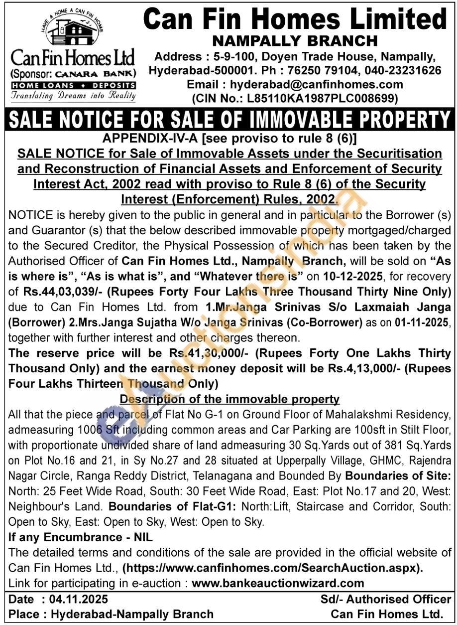 All That The Semi Finished Flat No 202 In Second Floor Known as Veda Residency, Admeasuring 700 Sft (Including Common Area) Together With Proportionate Undivided Share Of Land 30 Sq Yards (Out of 222.22 Sq. Yards) In Plot No. 14 In Sy No 2/4 Situated At Hydershakote Village, Rajendra Nagar Mandal Ranga Reddy Dist Telangana State And Bounded By Boundaries Of Site: North: Plot No. 13, South: Plot No. 15. East: 25 Feet Wide Road, West: Plot No. 17. Boundaries Of Flat: North: Corridor, South: Open to Sky, East: Flat No 201, West: Open to Sky.