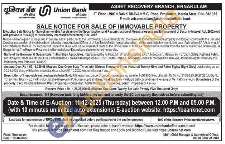 property admeasuring an extent of 0.9854 Hec of land in Re Sy No. 310/24,25,26,27,22 (old Sy No. 1012/4,5) in Block No.31 with industrial shed thereon in Puthussery central village, Palakkad Taluk Palakkad district standing in the name of Ms. Fathima Febin. Boundaries of the property: East: Panchayath Road, West: Properties of Sebestian, North: Kudiyinppu Properties, South: Properties of Xaviour