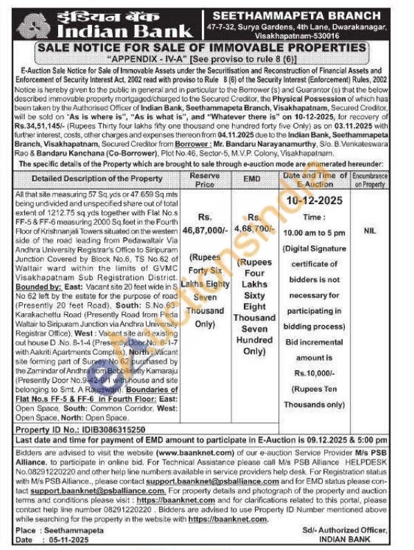 All that site measuring 57 Sq.yds or 47 659 Sq.mts being undivided and unspecified share out of total extent of 1212.75 sq yds together with Flat No s FF-5 & FF-6 measuring 2000 Sq.feet in the Fourth Floor of Krishnanjali Towers situated on the westem side of the road leading from Pedawaltair Via Andhra University Registrar's Office to Siripuram Junction Covered by Block No.6, TS No.62 of Waltair ward within the limits of GVMC Visakhapatnam Sub Registration District. Bounded by: East: Vacant site 20 feet wide in 5 No 62 left by the estate for the purpose of road (Presently 20 feet Road), South: S.No.63 Karakachettu Road (Presently Road from Peda Waltair to Siripuram Junction via Andhra University Registrar Office), West: Vacant sile and existing out house D.No. 8-1-4 (Presently Door No. 8-1-7 with Aakriti Apartments Complex), North: Vacant site forming part of Survey No. 62 purchased by the Zamindar of Andhra from Bobbilisetty Kamaraju (Presently Door No.9-42-9/1 with house and site belonging to Smt. A Rajeswari). Boundaries of Flat No.s FF-5 & FF-6 in Fourth Floor: East: Open Space, South: Common Corridor, West: Open Space, North: Open Space.