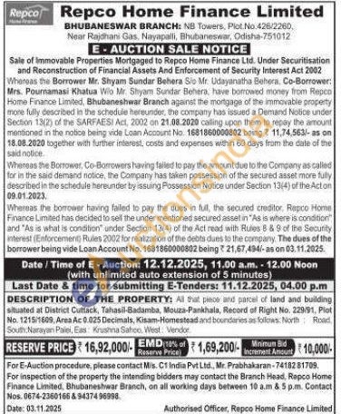 All piece and parcel of land and building situated at District Cuttack, Tahasil-Badamba, Mouza-Pankhala, Record of Right No. 229/91, Plot No. 1215/1609, Area Ac 0.025 Decimals, Kisam-Homestead and boundaries as follows. North South: Narayan Paliei, Eas Krushna Sahoo. West. Vendor
