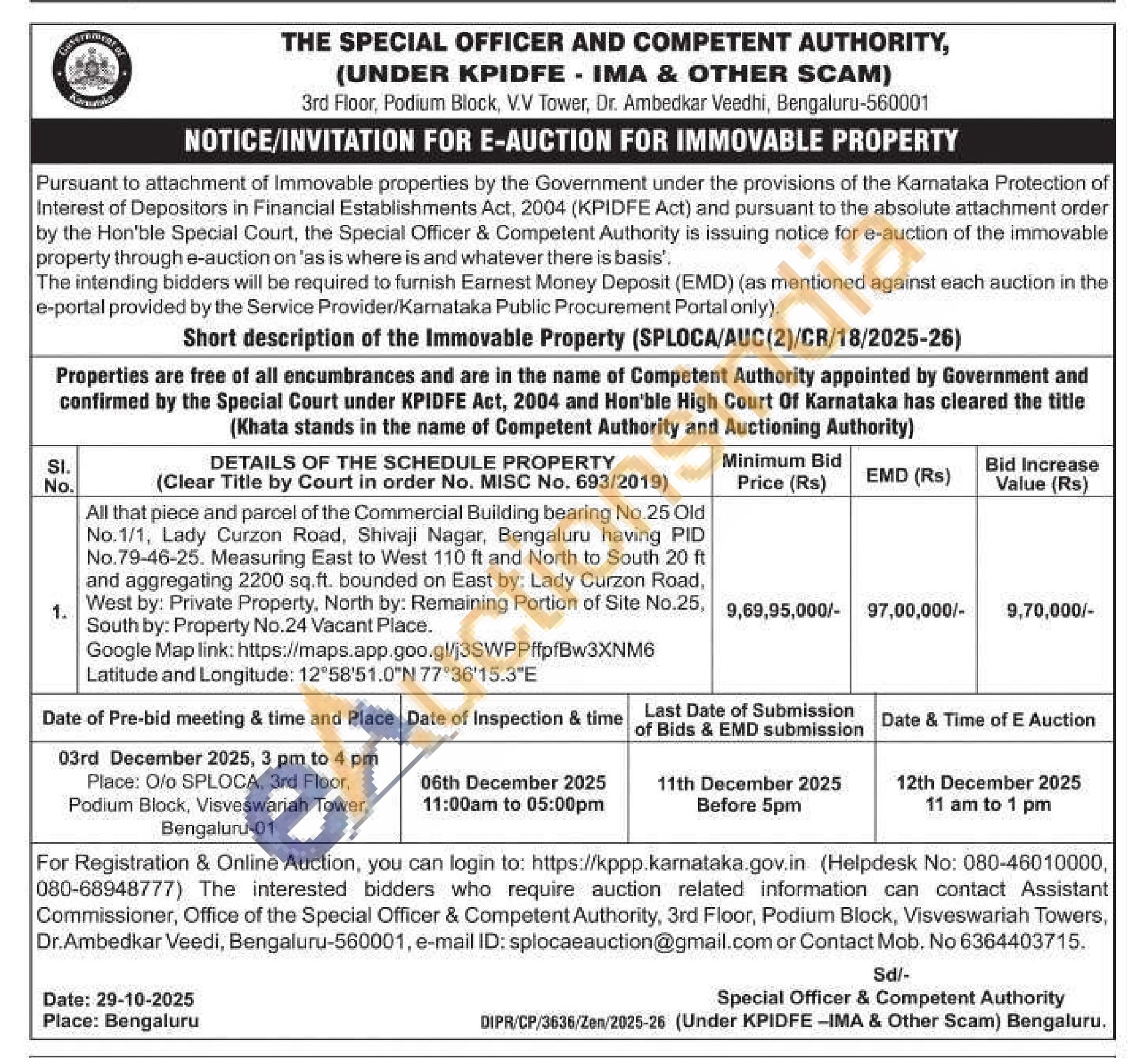 All that piece and parcel of the Commercial Building bearing No.25 Old No.1/1, Lady Curzon Road, Shivaji Nagar, Bengaluru having PID No.79-46-25. Measuring East to West 110 ft and North to South 20 ft and aggregating 2200 sq.ft. bounded on East by: Lady Curzon Road, West by: Private Property, North by: Remaining Portion of Site No.25, South by: Property No.24 Vacant Place.