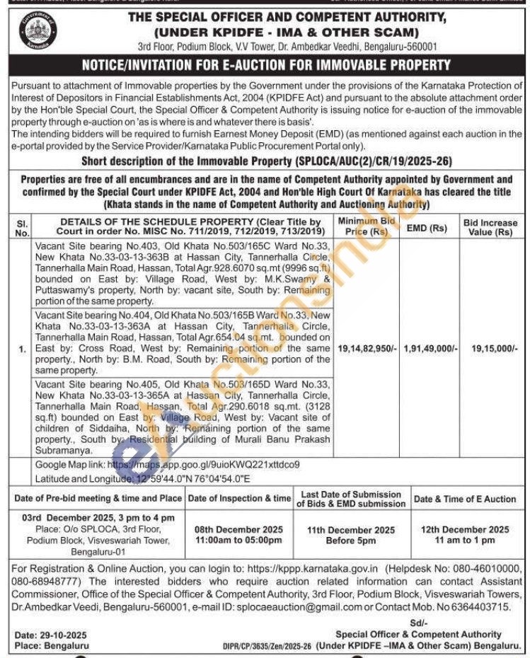 Vacant Site bearing No.403, Old Khata No.503/165C Ward No.33, New Khata No.33-03-13-363B at Hassan City, Tannerhalla Circle, Tannerhalla Main Road, Hassan, Total Agr.928.6070 sq.mt (9996 sq.ft) bounded on East by: Village Road, West by: M.K.Swamy & Puttaswamy's property, North by: vacant site, South by: Remaining portion of the same property.
