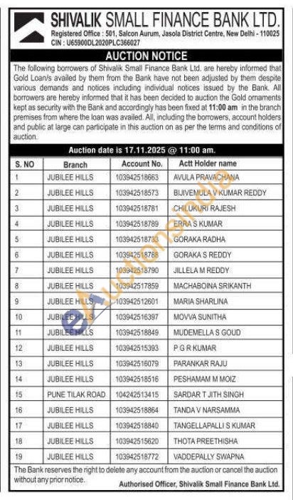 Shivalik Small Finance Bank Ltd Gold Auctions Auction in New Delhi