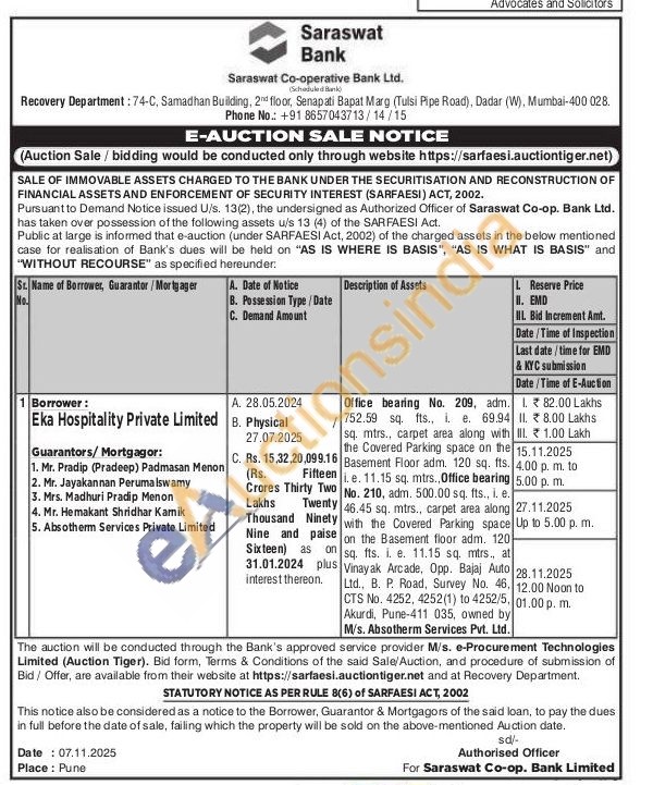 Office bearing No. 209, adm. 752.59 sq. fts., 1. e. 69.94 sq. mtrs.. carpet area along with the Covered Parking space on the Basement Floor adm. 120 sq. fts. e. 11.15 sq. mtrs. Office bearing No. 210, adm. 500.00 sq. fts., i. e. 46.45 sq. mtrs., carpet area along with the Covered Parking space on the Basement floor adm. 120 sq. fts. i. e. 11.15 sq. mtrs., at Vinayak Arcade, Opp. Bajaj Auto Ltd., B. P. Road, Survey No. 46. CTS No. 4252, 4252(1) to 4252/5. Akurdi, Pune-411 035, owned by M/s. Absotherm Services Pvt. Ltd.