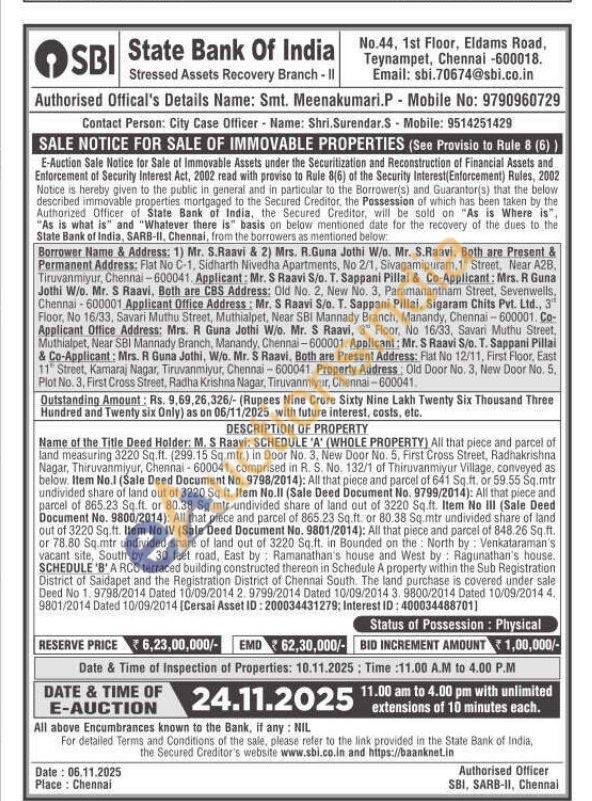 Name of the Title Deed Holder: M. S Raavi: SCHEDULE 'A' (WHOLE PROPERTY) All that piece and parcel of land measuring 3220 Sq.ft. (299.15 Sq.mtr.) in Door No. 3, New Door No. 5, First Cross Street, Radhakrishna Nagar, Thiruvanmiyar, Chennai-600041, comprised in R. S. No. 132/1 of Thiruvanmiyur Village, conveyed as below. Item No.1 (Sale Deed Document No. 9798/2014): All that piece and parcel of 641 Sq.ft. or 59.55 Sq.mtr undivided share of land out of 3220 Sq.ft. Item No.Il (Sale Deed Document No. 9799/2014): All that piece and parcel of 865.23 Sq.ft. or 80.38 Sq.mtr undivided share of land out of 3220 Sq.ft. Item No III