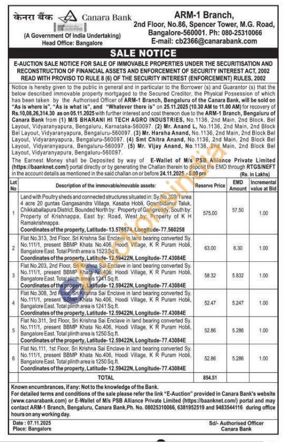 3) Flat No.203, 2nd Floor, Sri Krishna Sai Enclave in land bearing converted Sy. No.111/1, present BBMP Khata No.406, Hoodi Village, KR Puran Hobli, Bangalore East. Total plinth area is 1241 Sq.ft. Coordinates of the property, Latitude-12.59422N, Longitude-77.43084E