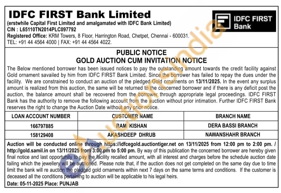 IDFC First Bank Ltd Gold Auctions Auction in Chennai