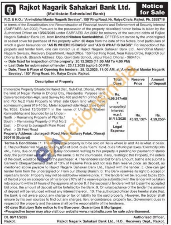 Immovable Property Situated in Rajkot Dist., Sub-Dist. Dhoraji, Within the limit of Nagar Palika in Dhoraji City, Residential Purpose land Converted into Non-Agri, land Survey No.466 and 467/1 of Plot No.1 and Plot No.2 Paiki Property to West side Open land which have admeasuring area 919-10 Sq. Meter acquired vide Regd. Sale Deed No. 1058, Dated 13/05/2011 in the name of Undhad Nitaben Kamleshbhai