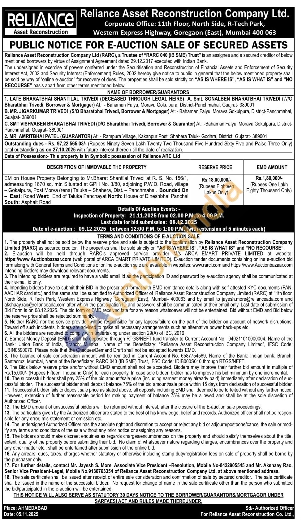 EM on House Property Belonging to Mr.Bharat Shantilal Trivedi at R. S. No. 156/1, admeasuring 1670 sq. mtr. Situated at GPH No. 3/80, adjoining P.W.D. Road, village -Gokalpura, Post Morva (rena) Taluka-Shahera, Dist.-Panchmahal. Bounded On -East: Road West: End of Taluka Panchayat North: House of Dineshbhai Panchal South: Asphalt Road
