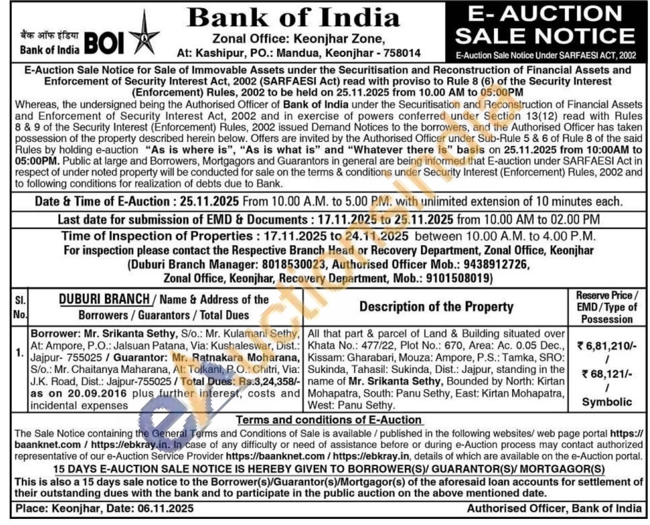 All that part & parcel of Land & Building situated over Khata No.: 477/22, Plot No.: 670, Area: Ac. 0.05 Dec., Kissam: Gharabari, Mouza: Ampore, P.S.: Tamka, SRO: Sukinda, Tahasil: Sukinda, Dist.: Jajpur, standing in the name of Mr. Srikanta Sethy, Bounded by North: Kirtan Mohapatra, South: Panu Sethy, East: Kirtan Mohapatra, West: Panu Sethy.