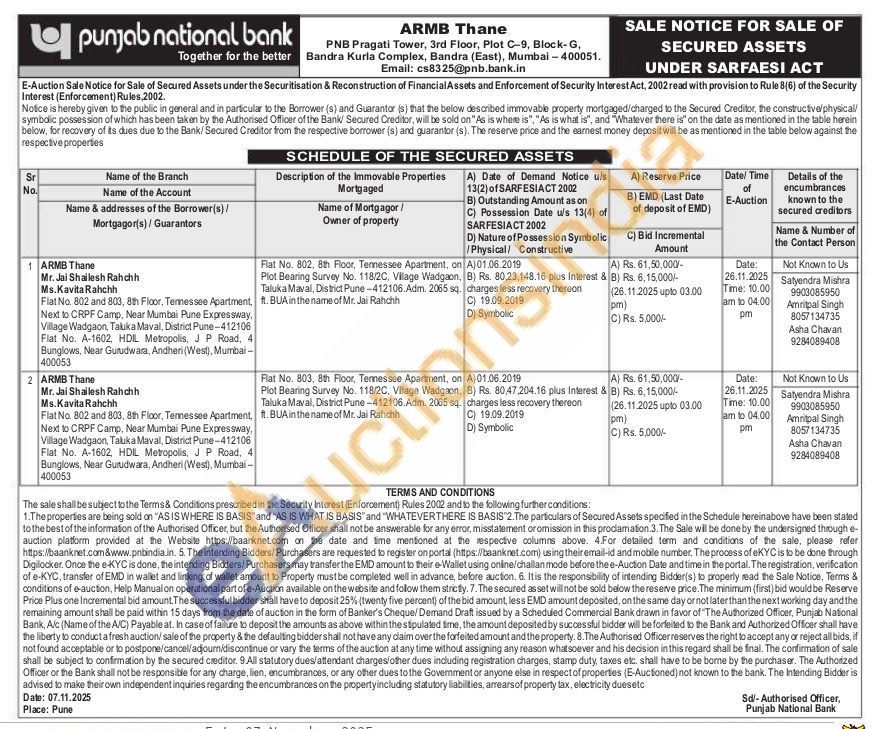 Flat No. 803, 8th Floor, Tennessee Apartment, on Plot Bearing Survey No. 118/2C, Village Wadgaon, Taluka Maval, District Pune-412106.Adm. 2065 sq. ft. BUA in the name of Mr. Jai Rahchh