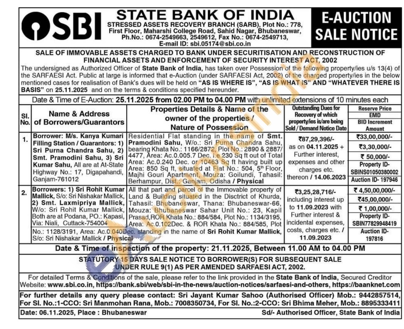Residential Flat standing in the name of Smt. Pramodini Sahu, W/o.: Sri Purna Chandra Sahu, bearing Khata No.: 1166/2872, Plot No.: 2890 & 2887/4477, Area: Ac.0.005.7 Dec. i.e 230 Sq ft out of Total Area: Ac.0.240 Dec. or 10463 Sq ft having built up Area: 850 Sq ft, situated at Flat No.: 504, 5th Floor, Majhi Gouri Apartment, Mouza: Goilundi, Tahasil Berhampur, Ganjam