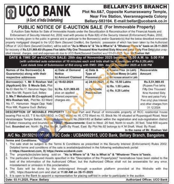 DESCRIPTION OF MOVABLE PROPERTY All that Part and Parcel of Immovable property of RCC residential house bearing Plot no.83, TS No. 628/183/2, in CMC Ward no. 16, CTS Ward no. 15, Block No. 16 situated at Rupanagudi Road, Near Varabasappa Temple Ballan, Municipal Assessment No.26041/83 at Ballari within the registration and sub-registration district of Ballari measuring and bounded as follows: Measurements: East to West -20 feet, North to south-30 feet, Total 600 square feet. Bounded on: North: By Plot No. 64, South By Road, East: By Plot No 82 belongs to KM Shafi, West: By Road.