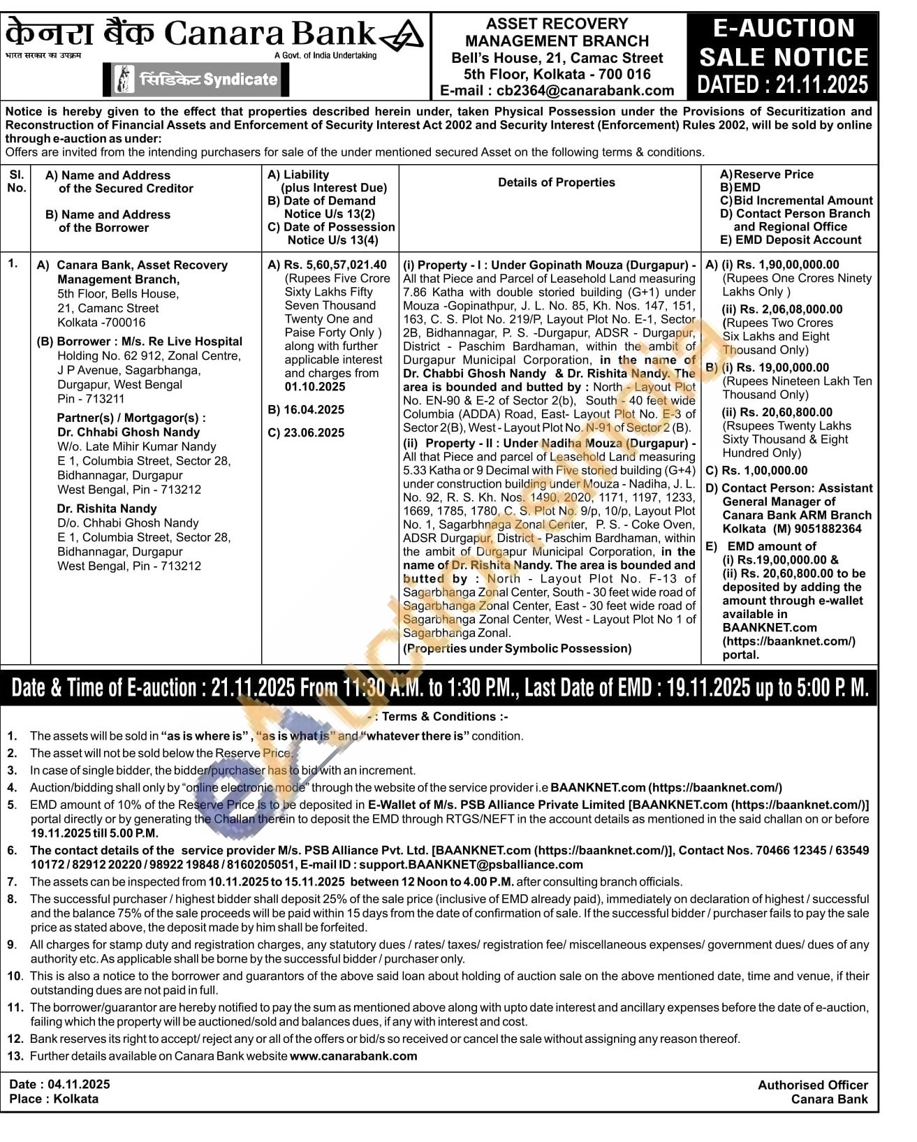 Under Gopinath Mouza (Durgapur) All that Piece and Parcel of Leasehold Land measuring 7.86 Katha with double storied building (G+1) under Mouza -Gopinathpur, J. L. No. 85, Kh. Nos. 147, 151, 163, C. S. Plot No. 219/P, Layout Plot No. E-1, Sector 2B, Bidhannagar, P. S. -Durgapur, ADSR - Durgapur, District Paschim Bardhaman, within the ambit of Durgapur Municipal Corporation, in the name of Dr. Chabbi Ghosh Nandy & Dr. Rishita Nandy. The area is bounded and butted by: North Layout Plot No. EN-90 & E-2 of Sector 2(b), South40 feet wide Columbia (ADDA) Road, East- Layout Plot No. E-3
