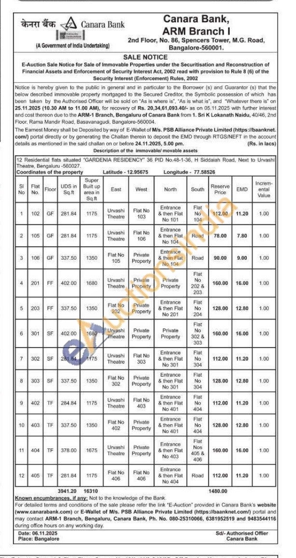 Residential flats situated 'GARDENIA RESIDENCY 36 PID No.48-1-36, H Siddalah Road, Next to Urvashi Theatre, Bengaluru -560027. Coordinates of the property Latitude-12.95675 Longitude 77.58526 4) Flat No : 201