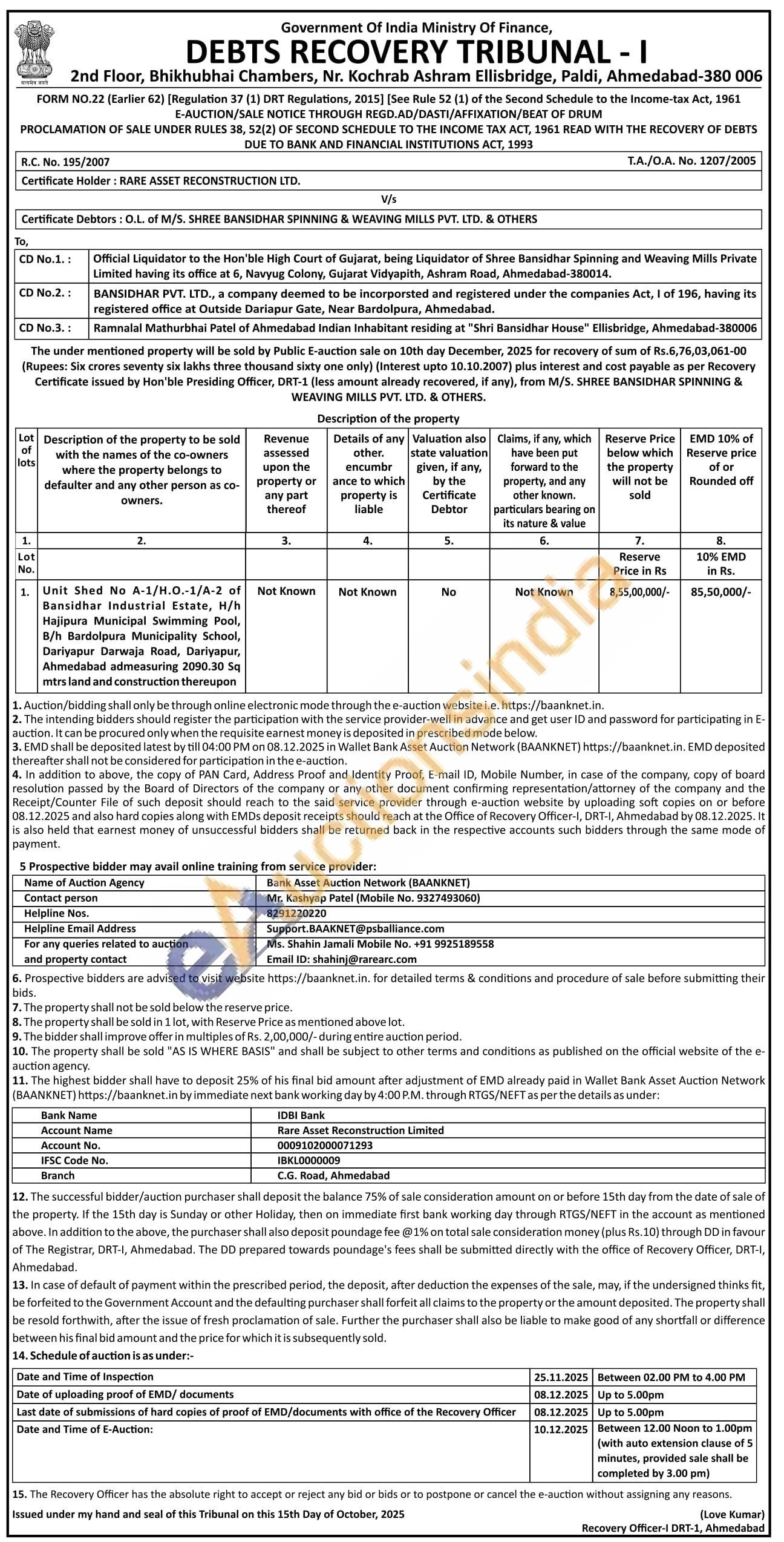 Unit Shed No A-1/H.D.-1/A-2 of Bansidhar Industrial Estate, H/h Hajipura Municipal Swimming Pool, B/h Bardolpura Municipality School, Dariyapur Darwaja Road, Dariyapur, Ahmedabad admeasuring 2090.30 Sq mtrs land and construction thereupon