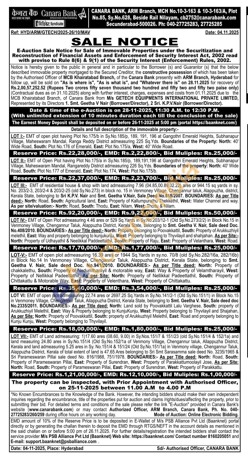 Bank, Ph. No. : 040 27725283/260/259