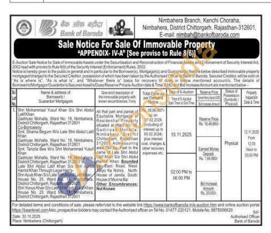 All that part and parcel of Equitable Mortgage of Residential Property situated at Ward No. 18 Gadiriyan Mohalla Chittorgarh, Rajasthan 312601 Admeasuring area 754 St Feat in the name of Late Shin Abdul Lallif Khan Sib St Abdul Hamid Khan Bounded by East Road West Teliyo Ka Notes North House of Jamia South House of Munna Bai Other Encumbrances Net Known