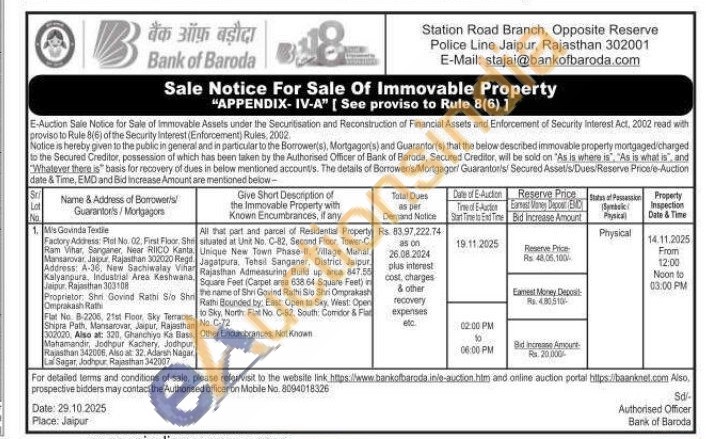 All that part and parcel of Residential Property situated at Unt No. C-82, Second Floor, Tower-C Unique New Town Phase-II. Village Mahal Jagatpura, Tehsil Sanganer, District Jaipur Rajasthan Admeasuring Build up area 847.50 Square Feet (Carpel area 638 64 Square Feet) the name of Shri Govind Rathi Sio Shri Omprakash Rathi Bounded by East Open to Sky West: Open to Sky, North Fiat No. C-82, South: Comidor & Flan No. C-72 Other Encumbrances: Not Known