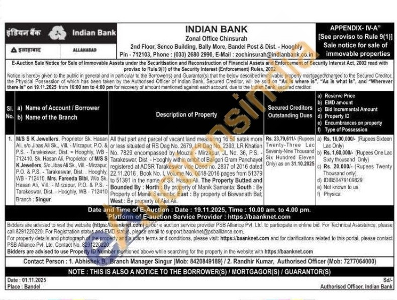 All that part and parcel of vacant land measuring 16.50 satak more or less situated at RS Dag No. 2679, LR Dag No. 2393, LR Khatian WB-No. 7829 encompassed by Mouza Mirzapur, JL No. 36, P.S. Tarakeswar, Dist. - Hooghly within ambit of Baligori Gram Panchayet registered at ADSR Tarakeswar vide Deed no. 2837 of 2016 dated 22.11.2016, Book No. 1, Volume No. 0618-2016 pages from 51379 to 51391 in the name of Sk. Hasan Ali. The Property Butted and Bounded By: North: By property of Manik Samanta, South: By Property of Manik Samanta: East: By property of Biswanath Bal; West: By property of Ajet Ali